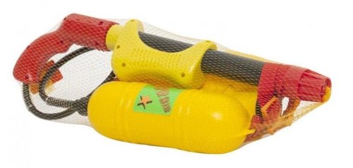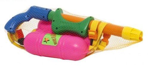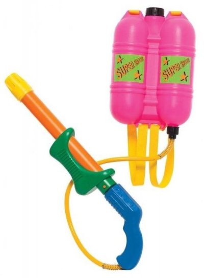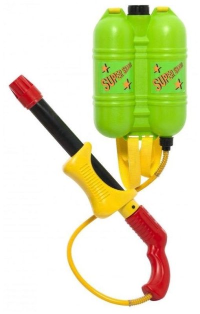 Plastová vodná pištoľ s dvojitým zásobníkom na vodu. Zásobník je s pištoľou spojený hadičkou. Stačí pumpovať vodná bitka môže začať. Zásobník na vodu má objem cca 2,5 litra a vďaka popruhom s prackami je možné umiestniť na chrbát.