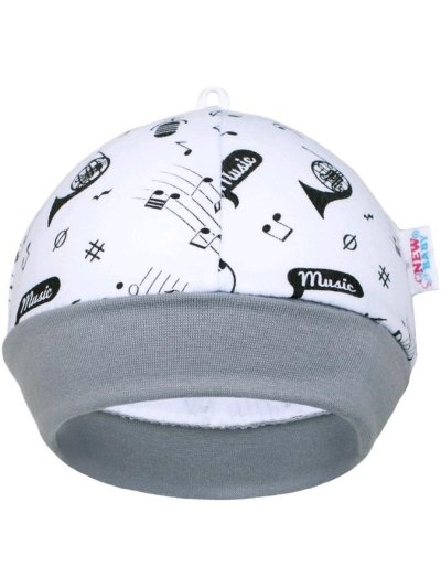 Bavlnená dojčenská čiapočka New Baby Music pre bábätká. Čiapočka má široký pružný lem, ktorý krásne kryje ušká a netlačí. Čiapočku zdobí potlač notičiek a hudobných nástrojov. Mäkký, príjemný a veľmi kvalitný materiál zaručí spokojnosť Vášho dieťaťa. Naša hravá čiapočka je vhodná pre chlapcov aj dievčatká. Zloženie: 100% bavlna. Obvod okolo hlavičky cca 33 cm.