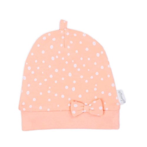 Čiapočka Nicol Rainbow. Čiapočka je celopotlačená bodkami s roztomilou mašličkou. Lem je široký a netlačí na hlavičku bábätka. Rainbow je nová dych vyrážajúca kolekcia navrhnutá s ohľadom na potreby našich najmenších. Zloženie: 100% bavlna.