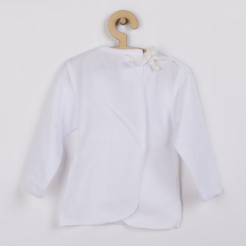 Dojčenská tenká bavlnená košieľka. Košieľka je biela so zaväzovaním vzadu na šnúrky. Zloženie 100% bavlna. Rozmer: dĺžka od ramienok cca 29 cm, obvod hrudníkov cca 42 cm, dĺžka rukáva cca 24 cm.