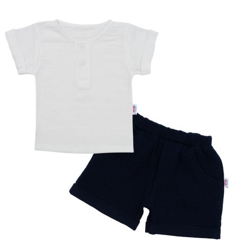 2-dielna mušelínová dojčenská súpravička českej značky New Baby Summer Nature Collection pre chlapčekov. Letná súpravička sa skladá z trička a kraťasov. Tričko má krátky rukáv a dokonalý strih. Kraťasy sú zdobené kapsičkami av páse majú širšiu gumu, ktorá ale netlačí na bruško dieťaťa. Súpravička je ľahučká a veľmi príjemná pri nosení. Zloženie: 100% bavlna. Mušelín je jedna z najčistejších, najjednoduchších a najjemnejších tkanín na svete. Jemne tkaný priedušný materiál je taký dokonalý, že si ho zamilujú deti po celom svete. Ľahká štruktúra umožňuje mušelínu „dýchať“ a zaisťuje dostatočnú cirkuláciu vzduchu, čím znižuje riziko prehriatia. Mušelín je veľmi odolný a to tak, že bez problémov zvláda opakované pranie a postupom času je ľahší a jemnejší.