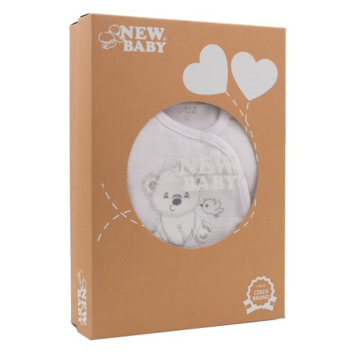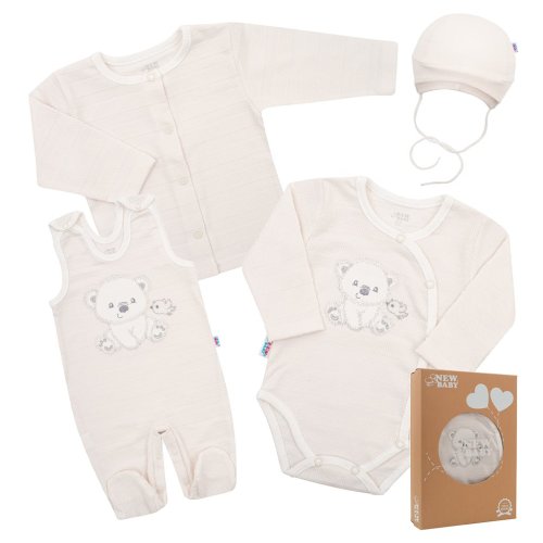 4-dielna súpravička českej značky New Baby Sweet Bear pre bábätká. Súpravička je vyrobená z kvalitného materiálu, ktorý je vhodný pre bábätká a je vhodná nielen do pôrodnice. Obsahuje celorozopínacie body s dlhým rukávom, dupačky, kabátik a čiapočku. Celorozopínacie body zdobia vyšitý obrázok medvedíka a vtáčika. Dupačky zdobia roztomilý obrázok medvedíka a vtáčika. Zapínanie na cvočky na ramienkach a medzi nožičkami. Kabátik je jednofarebný s krásnym lemovaním okolo ručičiek. Zapínanie je na cvočky po celej dĺžke. Čiapočka je krásne tvarovaná na ušká a zaväzuje sa na šnúrky. Súpravička je v praktickej Eko krabičke. Celá súpravička má nový neobyčajný dizajn s atraktívnym vzorom látky. Zloženie: 100% bavlna.