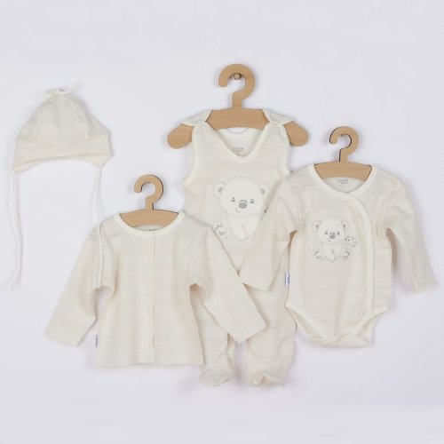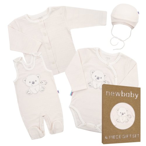4-dielna súpravička českej značky New Baby Sweet Bear pre bábätká. Súpravička je vyrobená z kvalitného materiálu, ktorý je vhodný pre bábätká a je vhodná nielen do pôrodnice. Obsahuje celorozopínacie body s dlhým rukávom, dupačky, kabátik a čiapočku. Celorozopínacie body zdobia vyšitý obrázok medvedíka a vtáčika. Dupačky zdobia roztomilý obrázok medvedíka a vtáčika. Zapínanie na cvočky na ramienkach a medzi nožičkami. Kabátik je jednofarebný s krásnym lemovaním okolo ručičiek. Zapínanie je na cvočky po celej dĺžke. Čiapočka je krásne tvarovaná na ušká a zaväzuje sa na šnúrky. Súpravička je v praktickej Eko krabičke. Celá súpravička má nový neobyčajný dizajn s atraktívnym vzorom látky. Zloženie: 100% bavlna.