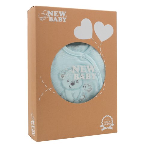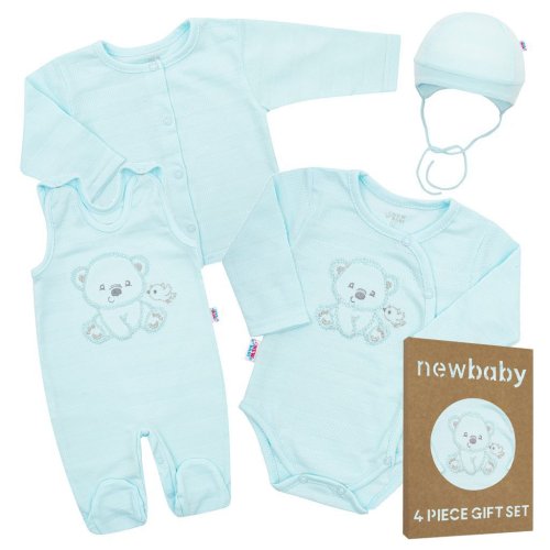 4-dielna súpravička českej značky New Baby Sweet Bear pre bábätká. Súpravička je vyrobená z kvalitného materiálu, ktorý je vhodný pre bábätká a je vhodná nielen do pôrodnice. Obsahuje celorozopínacie body s dlhým rukávom, dupačky, kabátik a čiapočku. Celorozopínacie body zdobia vyšitý obrázok medvedíka a vtáčika. Dupačky zdobia roztomilý obrázok medvedíka a vtáčika. Zapínanie na cvočky na ramienkach a medzi nožičkami. Kabátik je jednofarebný s krásnym lemovaním okolo ručičiek. Zapínanie je na cvočky po celej dĺžke. Čiapočka je krásne tvarovaná na ušká a zaväzuje sa na šnúrky. Súpravička je v praktickej Eko krabičke. Celá súpravička má nový neobyčajný dizajn s atraktívnym vzorom látky. Zloženie: 100% bavlna.
