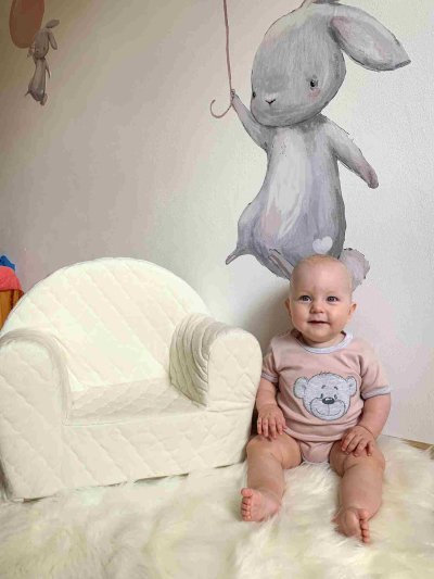 Nápadité bavlnené dojčenské body s krátkym rukávom a lemom českej značky New Baby BrumBrum pre bábätká. Body je zdobené roztomilou nášivkou s medvedíkom. Nášivka je podlepená látkou proti poškriabaniu. Zapínanie na cvočky na ramienku a medzi nožičkami uľahčuje obliekanie a prebaľovanie. Zloženie: 100% bavlna.