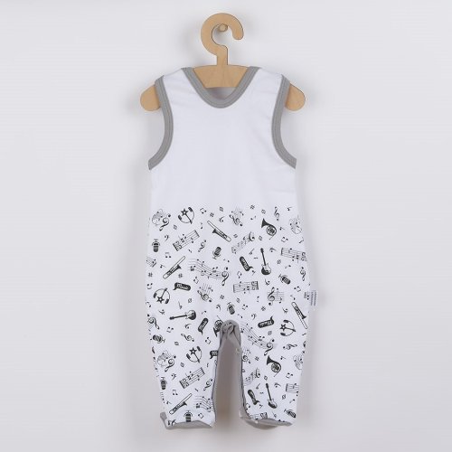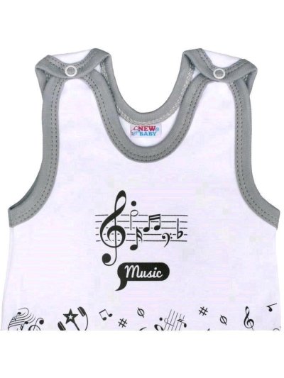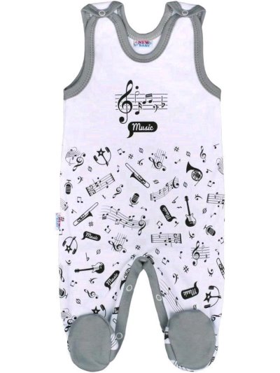 Bavlnené dojčenské dupačky New Baby Music pre bábätká. Dupačky sú jednofarebné s origínálnym obrázkom notičiek a nápisom Music. Spodná časť je celopotlačená notičkami a hudobnými nástrojmi. Zapínanie na cvočky na ramienkach a medzi nožičkami uľahčuje obliekanie a prebaľovanie. Naše originálne a zároveň veselé dupačky sú vhodné pre chlapcov aj dievčatká. Zloženie: 100% bavlna. Rozmery: obvod okolo hrudníka cca 24 cm, dĺžka od rozkroku cca 20 cm, dĺžka od ramienok cca 64 cm.