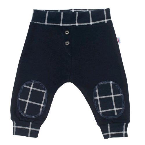 Tepláčiky českej značky New Baby Cool. Tepláčiky majú v páse širší lem s gumičkou, na nohavičkách širší lem a na kolienkach šmrncovné záplaty. Lemy a záplaty sú ušité z modernej kockovanej látky. Tepláky sú bez zapínania. Našité gombíky sú iba imitácie. Zloženie: 95% bavlna, 5% elastan.