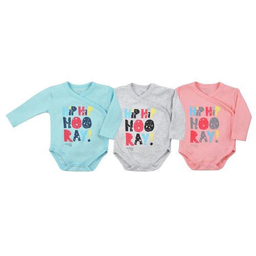 Dojčenské celorozopínacie body Koala Hip-Hip. Farebné body je zdobené nápisom. Zapína sa na cvočky po celej dĺžke a medzi nožičkami, čo uľahčuje obliekanie a prebaľovanie. Body je pre bábätká dôležitým kúskom oblečenia. Pri akomkoľvek pohybe sú chrbát bábätka stále prikryté. Zloženie: 100% bavlna.