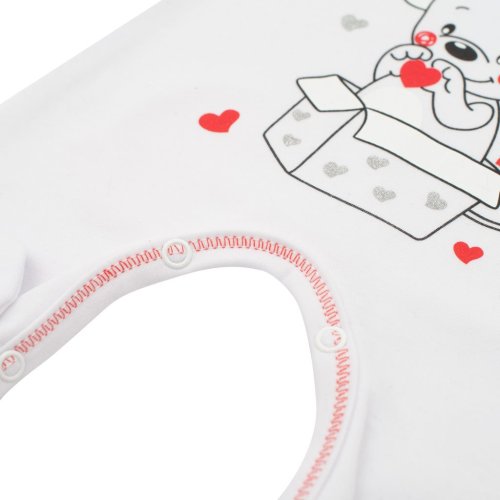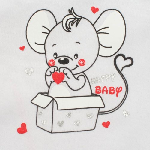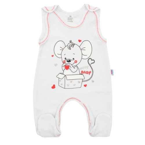 Dojčenské dupačky New Baby Mouse. Dupačky sú zdobené farebným lemovaním a veľkým obrázkom myšky. Zapínanie na cvočky na ramienku a medzi nožičkami. Majú veľmi príjemný a kvalitný materiál. Zloženie: 100% bavlna. Produkt českej značky.