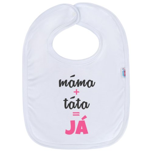 Krásny bavlnený detský podbradník s vtipným obrázkom New Baby. Podbradník je zdobený nápisom mama + otec = JA. Farby použité na potlač sú certifikované a vhodné pre bábätká. Je vyrobený z príjemného a kvalitného materiálu. Podbradník má biele lemovanie a je vyrobený z dvoch vrstiev bavlnenej látky. Zapínanie na cvoček. Detský podbradník chráni oblečenie bábätka pred znečistením pri jedle a pití. Zloženie: 100% bavlna. Rozmery: dxs cca 36x26 cm. - Produkt českej značky