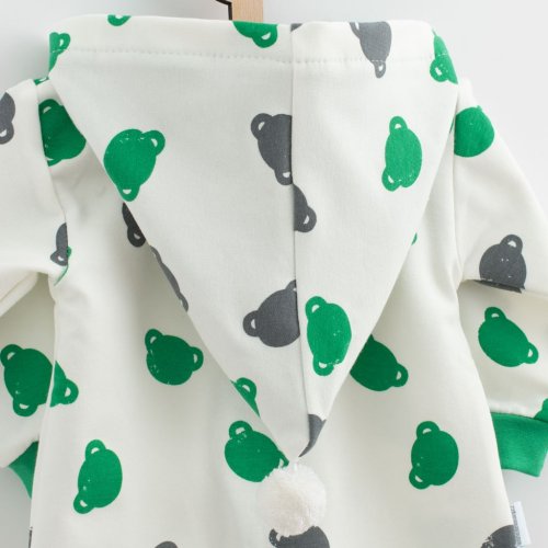 Roztomilý a praktický overal s kapucňou českej značky New Baby Little One. Overal je celopotlačený medvedíkmi, má zapínanie na zips po celej dĺžke a pružné lemy na rukávoch a nohavičkách. Kapucňa je podšitá farebnou podšívkou a je zdobená roztomilou brmbolcom. Overal je vyrobený z pohodlnej teplákoviny. Vhodný na celoročné nosenie. Materiál: 96% bavlna, 4% elastan.