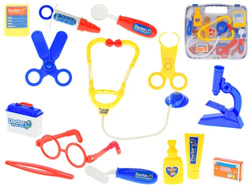 Doktorská sada pre malých pánov doktorov a pani doktorky. Tento set obsahuje 14 ks plastového náčinia, bez ktorého sa skutočný lekár nezaobíde. Všetko je uložené v praktickom kufríku.