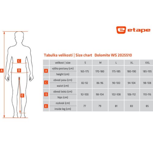 Športové nohavice ETAPE Dolomite WS sú ideálnou voľbou pre mužov, ktorí hľadajú pohodlné a funkčné nohavice na cyklistiku, behanie alebo len bežné nosenie pri teplotách od -15 °C do 5 °C. Nohavice sú vyrobené z funkčného a elastického materiálu SoftShell, ktorý je odolný vetru a vode s vynikajúcimi termoizolačnými a transpiračnými vlastnosťami. Vďaka trojvrstvovej štruktúre ponúka maximálny komfort a ochranu. Navyše vďaka materiálu ThermoFit nohavice ponúkajú skvelé termoizolačné vlastnosti, sú elastické, mäkké, príjemne na dotyk a majú antibakteriálnu úpravu. Dolomite WS: - materiál SoftShell s membránou a zateplením - materiál ThermoFit so zateplením - pohodlný voľný strih - elastický pás so šnúrkou na stiahnutie - 2 vrecká na zips - zipsy na nohaviciach pre pohodlné obliekanie - protišmykový silikónový pásik na nohaviciach - reflexné bezpečnostné prvky rozsah: -15 °C až 5 °C Veľkostná tabuľka v obrázkoch. Uvedené hodnoty sú iba orientačné a vhodná veľkosť sa môže líšiť podľa konkrétneho typu postavy.