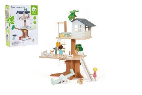 Deti si môžu postaviť dom na strome s mnohými doplnkami. Balenie obsahuje 2 figúrky (chlapčeka a dievčatko), figúrku psa, veveričku hojdačky, kladku, vedro, truhlu s pokladom, posteľ, stôl a stoličky. Pomocou klady môžu deti vyzdvihnúť vedro až do koruny stromov. Balenie obsahuje 31 drevených dielikov. Rozmer krabice: 29 x 36 x 11 cm Vhodné pre deti od 3 rokov