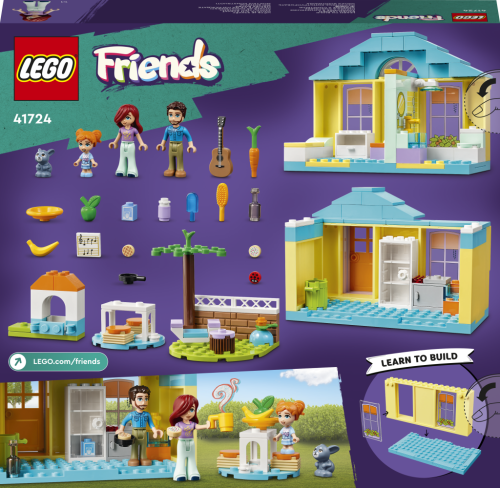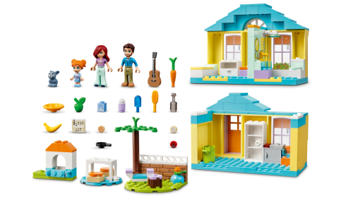 V dome Paisley od LEGO® Friends (41724) budú mať mladí stavitelia od 4 rokov stále čo preskúmavať. Na hornom poschodí je spálňa a kúpeľňa, ale možno ho zložiť, aby bolo jednoduchšie hrať sa aj v kuchyni dole. Nechýba množstvo doplnkov pre hranie príbehov, vrátane dobrôt a ovocia, vonkajšieho stola a koša na triedenie odpadkov. V záhrade má Paisley útulný kútik, kde hráva na gitaru a píše pesničky. Spoločnosť jej robí zajačik, pre ktorého má nachystanú mrkvičku.