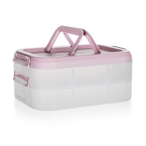 Plastový párty box o rozmere 40 x 28 x 17,8 cm, dve úložné poschodia v transparentnej farbe, držadlá a veko v ružovej farbe.