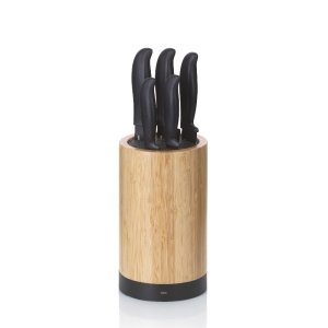 Univerzálny blok na nože bambus, s 5 kusmi oceľových nožov, rukoväť z čierneho PP s nepriľnavým povrchom: 1x kuchársky nôž; 1x nôž na mäso; 1x nôž na chlieb; 1x vykosťovací nôž; 1x kuchynský nôž;