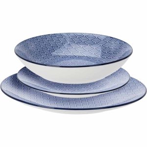 Jedálenská sada 18 dielov – porcelánElegantná jedálenská sada 18 dielov z kvalitného porcelánu s jemným japonským motívom v modrej farbe. Obsah sady: 6 × tanier 270 mm (270 × 270 × 28 mm) 6 × tanier 190 mm (190 ×