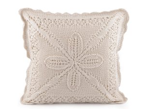 Pletené azúrové obliečky na vankúše sú dozdobené háčkovanou čipkou.