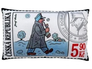 Mäkký vankúš s motívom dobrého vojaka Švejka od Jozefa Lady, vhodný na cesty aj ako dekorácia.