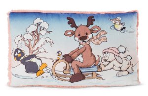 Na plyšovom vankúši z vysoko kvalitného plyšu NICI sú štyria priatelia slon Amadou, snežná líška Nordin, tučniak Icaak a myška Smoothy Ruth, ako si oddychujú medzi dvoma guľovačkami.
