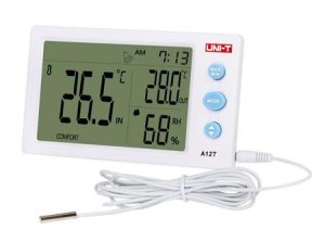 Teplomer UNI-T A12T Digitálny teplomer s vlhkomerom A12T slúži na meranie vnútornej teploty a vlhkosti a zároveň aj vonkajšie teploty.