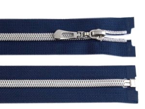 Deliteľný špirálový zips so striebornými zúbkami je vhodný na našitie na bundy, kabáty, mikiny alebo športové tašky.
