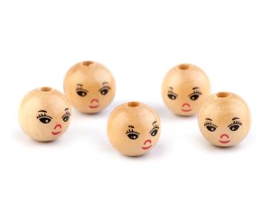 Drevené korálky s maľovanou tvárou majú vďaka nalakovaniu jemný lesk.