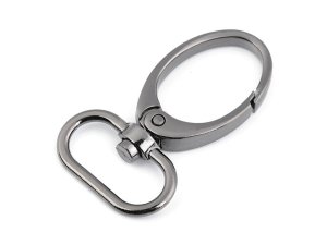 Kovová karabínka je otočná. Využijete ju predovšetkým na výrobu kľúčeniek a popruhov na tašky alebo kabelky.