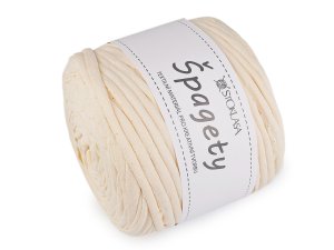 Špagetovú priadzu tvoria narezané prúžky látky z recyklovanej bavlny.
