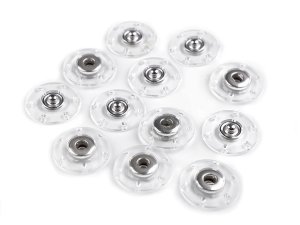 Plastové gombíky, ktoré sú z oboch strán hladké, využijete na našitie nielen na odevy, ale aj na doplnky (klobúky, rukavice, tašky a pod.).