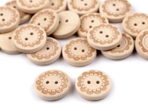 Drevené dekoračné gombíky zdobia laserom vyrezávaný motív kvetu.
