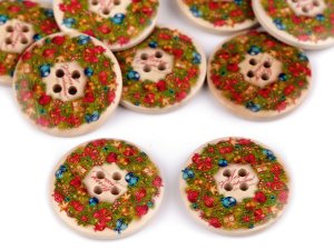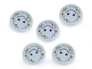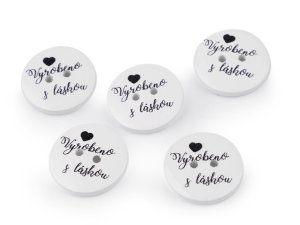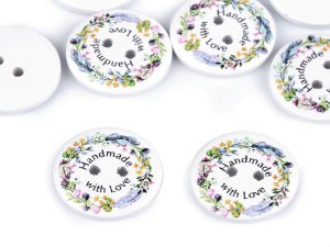 Drevené dekoračné gombíky zdobia kvetinová potlač a nápis "Vyrobené s láskou".