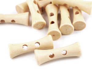 Originálne gombíky podlhovastého tvaru sú vyrobené z dreva.