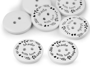 Drevené dekoračné gombíky zdobia nápis "Made with love" [a "Handmade with love".] Vyniknú na ručných výrobkoch, darčekoch a rôznych dekoráciách.