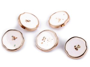 Luxusné kovové gombíky zaujmú svojim dizajnom - majú nepravidelný okrúhly tvar a nájdete v nich drobné kúsky perlete zaliate v živici.