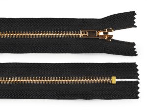 Zip so zlatými mosadznými zúbkami môžete vďaka jeho dĺžke našiť na kabáty a dlhšie bundy. Materiály polyester mosadz