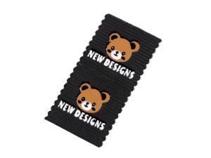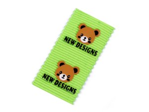 Ceduľka s obrázkom medvedíka je síce jednostranná, ale po ohnutí na polovice a prišití okolo lemu vrecká, čiapky a pod. má medvedíka na prednej aj zadnej strane.