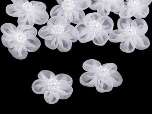 Jednoduchá saténová mašlička je uprostred zdobená perlou[, ktorá je k nej prišitá.] Použitie: Mašlička je vhodná na našitie na odevy.