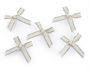 Jednoduchá saténová mašlička je uprostred zdobená perlou[, ktorá je k nej prišitá.] Použitie: Mašlička je vhodná na našitie na odevy.