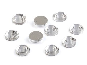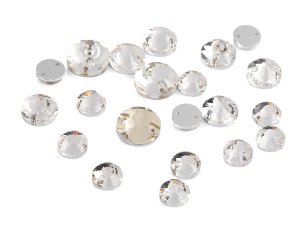 Sklenené kamene v kovovom puzdre sa vďaka efektnému brúsenému povrchu jemne trblietajú. Štvorcové kovové lôžko so štyrmi otvormi umožňuje ľahké našívanie.