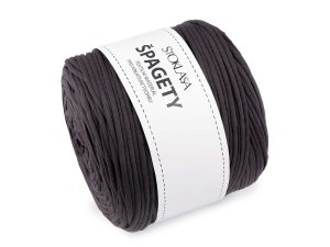 Špagetová priadza je plochá [, bez výplne (dutinka).] Využijete ju na pletenie a háčkovanie výrobkov väčších rozmerov, napríklad koberčekov, diek, tašiek, šál, košíkov, obliečky na vankúše, sedacích pufov a pod.