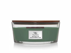 Vonná sviečka Mint Leaves & Oak v sebe ukrýva vôňu čerstvých lístkov mäty, ktorá dodáva žiarivú sviežosť drevitému akordu zeleného machu, obhoreného dubu a cyprusu.