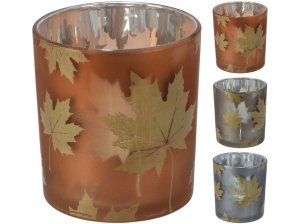 Sklenený svietnik 70×80 mm s tieňohrou listov na čajovú sviečku, zlatý – mix farieb.