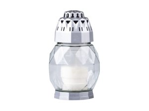 Cintorínska sviečka v dekoratívnom skle s diamantovým vzorom, vhodná pre pietne miesta.