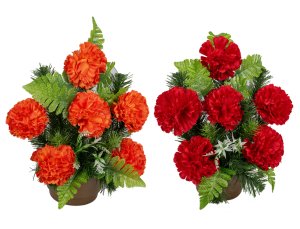 Väzba z umelých kvetov. Aranžmán z umelých kvetov imitujúcich chryzantémy je umiestnený v kvetináči so záťažou.