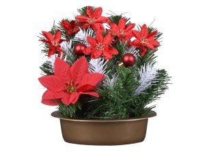 Väzba z umelých kvetov. Aranžmán z umelých kvetov imitujúcich vianočné hviezdy je umiestnený v nízkej nádobe.