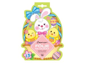 Fólia na vajcia 12 ks s veľkonočnými motívmi vajíčok, kuriatok a zajačikov, v pestrom mixe.