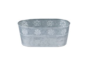 Oválny plechový kvetináč s motívom kvetín – dekoratívny a praktický doplnok v šedej a bielej.