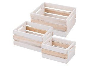 Súprava troch drevených debničiek v kombinácii prírodnej a bielej – dekoratívny a praktický doplnok pre domácnosť.